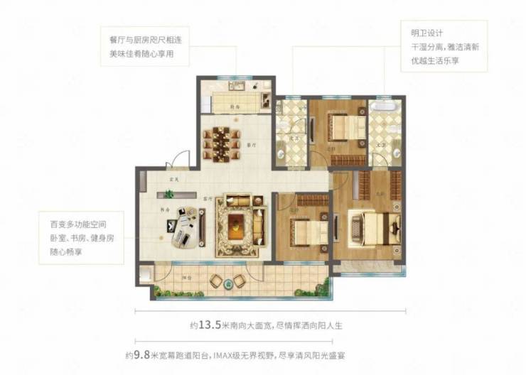 万城·春暖花开,沂河畔建面约142㎡低密洋房,郎阔三室设计,尺度与视野的双重奢享,对“健康户型”的定义进行全新诠释,让宅家健身生活需求能够轻松实现。