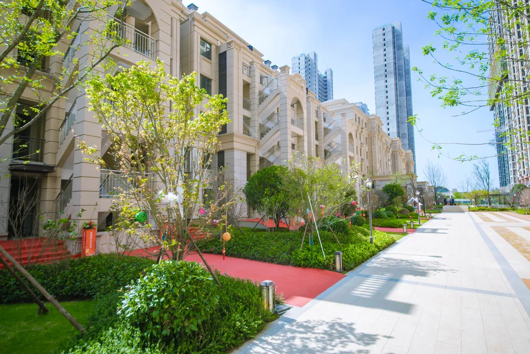 由于抬高地势,与道路形成高低差,社区外无法窥视社区内,让社区更加高端私密,社区内高绿化率带来自成一园的世外桃源生活感。