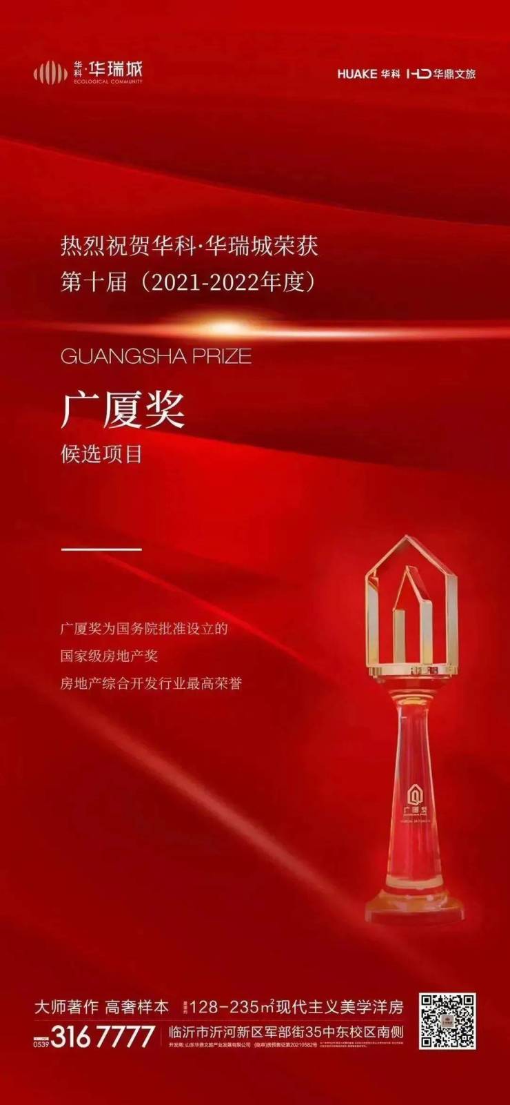 品质铸就荣誉,匠心凝就口碑。华瑞城将把获评“广厦奖”候选项目的荣誉转化为继续优化提升的内在动力,打造绿色低碳、宜居宜业、客户满意的好房子,不断实现人们对美好生活的向往,赋能沂河新区高质量发展。