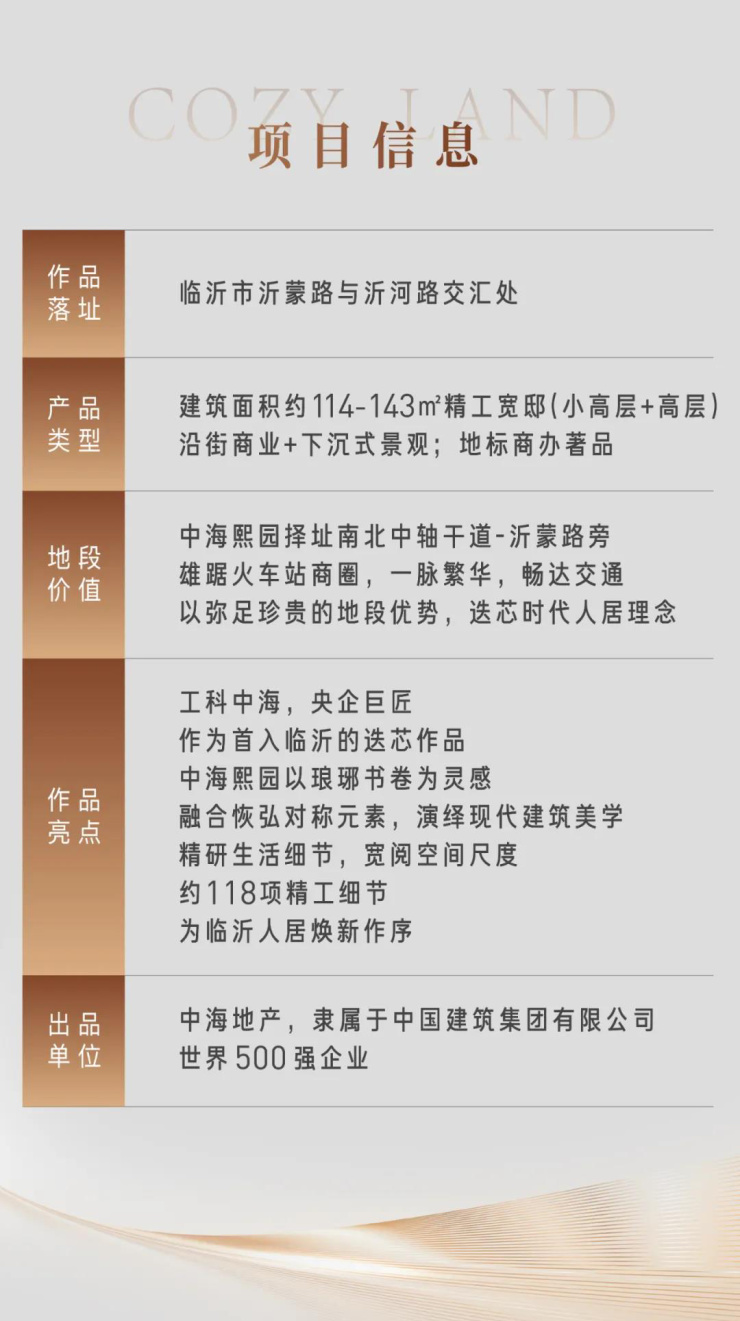 1.本项目推广名为“中海熙园”,备案名为“中海·万锦熙园”。开发公司为:“临沂海晟地产有限公司”。商品房预售证:“(临审)房预售证第20210105号”。2.本资料为要约邀请,不作为要约或承诺。3.相关宣传内容不排除因政府相关规划、规定及出卖人分期规划、未能控制等原因而发生变化。4.出卖人可能会不定期对宣传材料进行修改。5.买卖双方的权利义务以双方签订的《商品房买卖合同》及其补充协议、附件等书面文件为准。6.本资料制作时间为2022年1月10日前的信息,敬请留意较新资料。中海服务监督热线:95112。