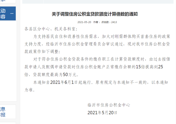 5月20日,临沂市住房公积金跟了下520的热度,用实际行动来宠爱临沂人~调整了住房公积金贷款额度计算倍数,由原先的15倍提高到25倍,贷款额度较高为50万元,自2021年6月1日起施行!