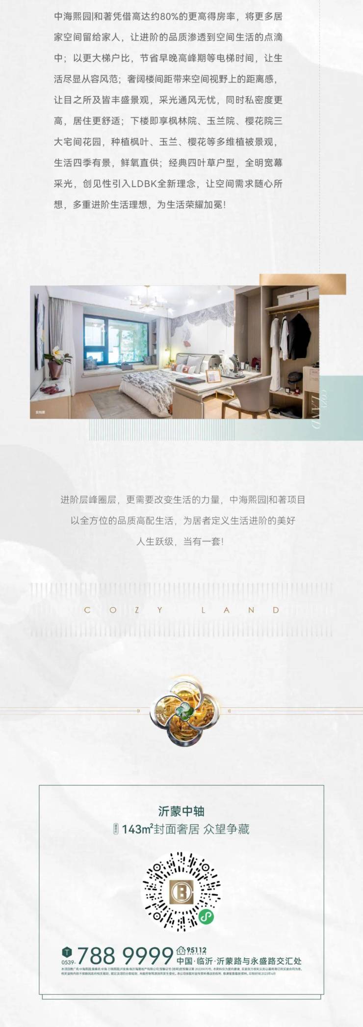 1. 本 项 目 推 广 名 为 “ 中 海 熙 园 ” , 备 案 名 为 “ 中 海 · 万 锦 熙 园 ” 。 开 发 公 司 为 : “ 临 沂 海 晟 地 产 有 限 公 司 ” 。 商 品 房 预 售 证 : “ ( 临 审 ) 房 预 售 证 第 2 0 2 2 0 0 7 0 号 ” 。 2 . 本 资 料 为 要 约 邀 请 , 不 作 为 要 约 或 承 诺 。 3 . 相 关 宣 传 内 容 不 排 除 因 政 府 相 关 规 划 、 规 定 及 出 卖 人 分 期 规 划 、 未 能 控 制 等 原 因 而 发 生 变 化 。 4 . 出 卖 人 可 能 会 不 定 期 对 宣 传 材 料 进 行 修 改 。 5 . 买 卖 双 方 的 权 利 义 务 以 双 方 签 订 的 《 商 品 房 买 卖 合 同 》 及 其 补 充 协 议 、 附 件 等 书 面 文 件 为 准 。 6 . 本 资 料 制 作 时 间 为 2 0 23 年4 月3 日 前 的 信 息 , 敬 请 留 意 最 新 资 料 。 中 海 服 务 监 督 热 线 : 9 5 1 1 2。