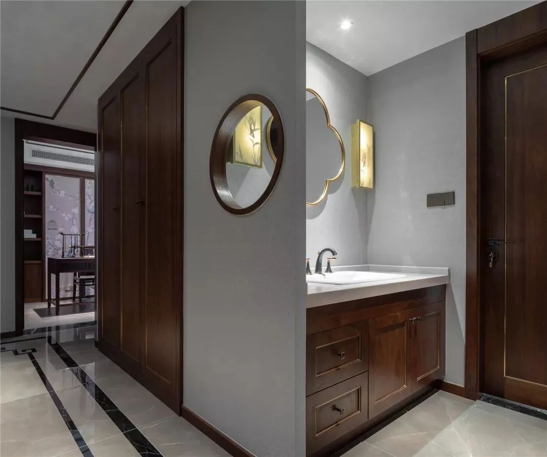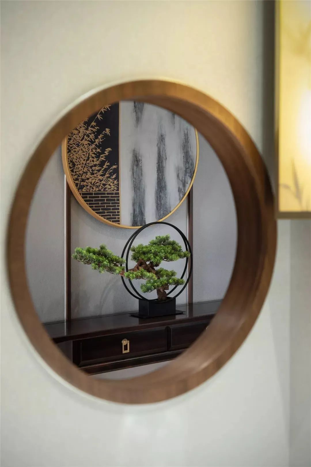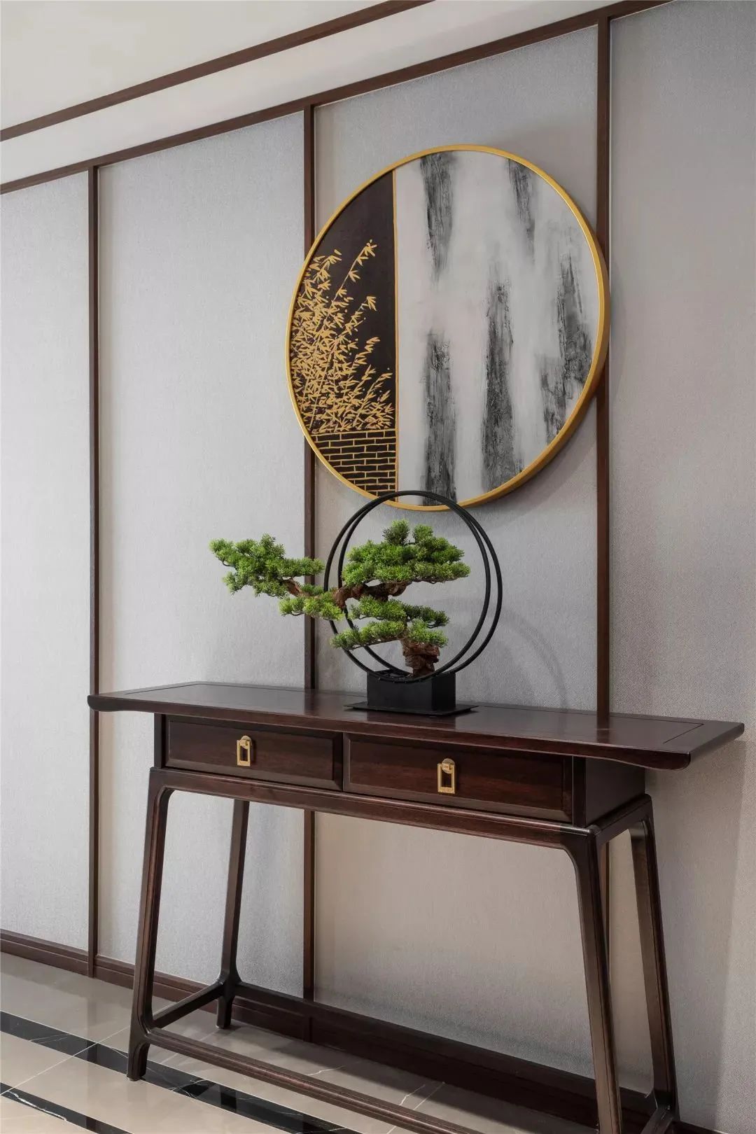 ▲入户玄关门廊处配有复古实木观景台和盆景。结合木质线条的墙面和圆形金属框装饰画的背景墙,入户空间充满了中国式古典宅院风格。