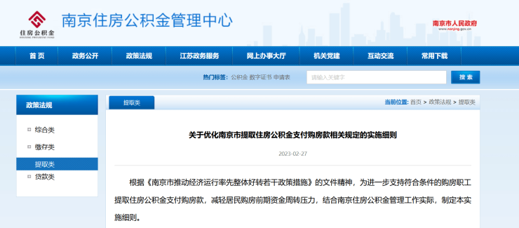 央广网北京2月28日消息 据南京住房公积金管理中心网站消息,为进一步支持符合条件的购房职工提取住房公积金支付购房款,减轻居民购房前期资金周转压力,2月27日,南京住房公积金管理中心发布《关于优化南京市提取住房公积金支付购房款相关规定的实施细则》(以下简称《实施细则》)。