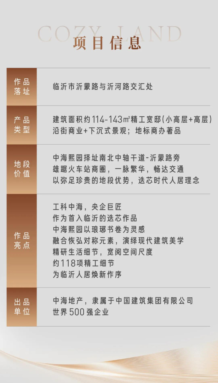 1.本项目推广名为“中海熙园”,备案名为“中海·万锦熙园”。开发公司为:“临沂海晟地产有限公司”。商品房预售证:“(临审)房预售证第20210105号”。2.本资料为要约邀请,不作为要约或承诺。3.相关宣传内容不排除因政府相关规划、规定及出卖人分期规划、未能控制等原因而发生变化。4.出卖人可能会不定期对宣传材料进行修改。5.买卖双方的权利义务以双方签订的《商品房买卖合同》及其补充协议、附件等书面文件为准。6.本资料制作时间为2022年1月27日前的信息,敬请留意较新资料。