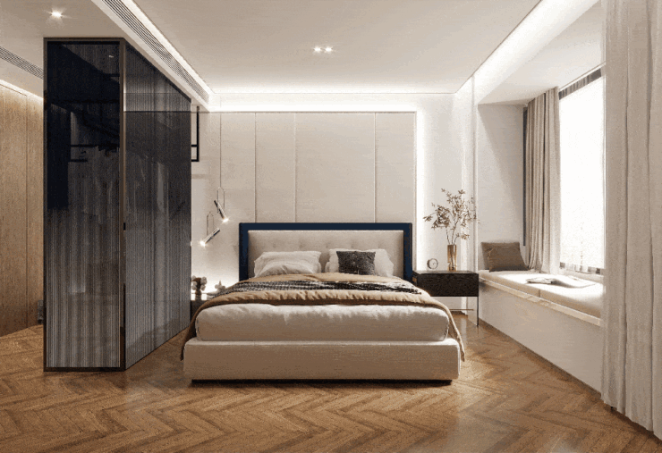 除此之外,创新式的尖叫收纳,与主卫与北卧全尺寸无界飘窗,也让整个空间的利用率大升级。隐藏式的收纳空间可进行多功能放置,飘窗在观景之余,也能进行高效的收纳利用。