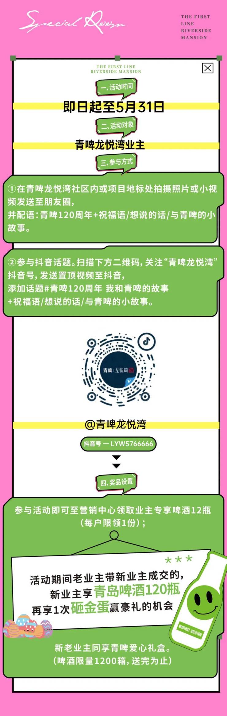 青岛啤酒飘香120载,每一位同行者都曾激情举杯; 青啤龙悦湾入沂12载,每一位居住者都深有感触。 故而,在青啤120周年之际,青啤龙悦湾发起“青啤120周年 ,我和青啤的故事”活动,诚邀业主家人开怀畅谈。 青啤龙悦湾将致献“有爱”好礼,致谢相伴与参与。