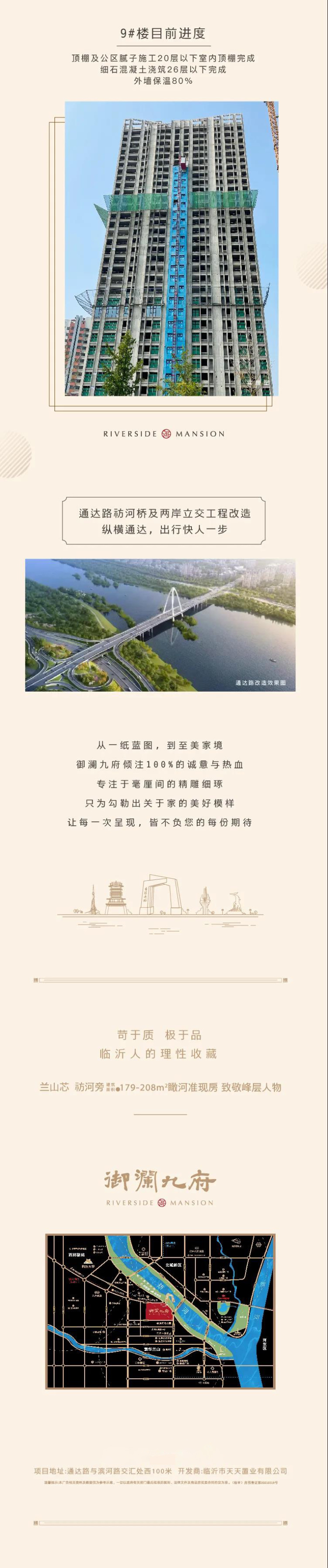 1、本项目开发商:临沂市天天置业有限公司;核准地名:御澜九府;2、本宣传资料为要约邀请,不作为要约或承诺;买卖双方的权利义务以双方签订的《商品房买卖合同》及其补充协议、附件等书面文件为准;3、本宣传资料内提到的商品房面积均为建筑面积,特别说明的除外;本宣传资料所涉及的户型仅供示意参考,所标尺寸面积、室内装修设计方案仅供参考,非实际交楼衡量之基准。相同户型因楼栋、单元或楼层不同,局部结构、面积、尺寸、管线布置等可能存在差异,具体以《商品房买卖合同》为准;4、交通配套信息、市政配套信息来源于官方网站数据,仅供参考。交通规划设置、市政配套设置不排除因政府规划、政策规定及出卖人未能控制的原因而发生变化,本资料旨在提供相关信息、不代表出卖人对此做出要约或承诺;5、部分素材来源于网络,其著作权归原作者所有;如果原作者表明其身份要求本公司停止使用该素材的,请及时与本司联系;6、相关宣传内容不排除因政府相关规划、规定及出卖人分期规划、未能控制的原因而发生变化;本公司保留对宣传资料修改的权利,敬请留意较新资料。