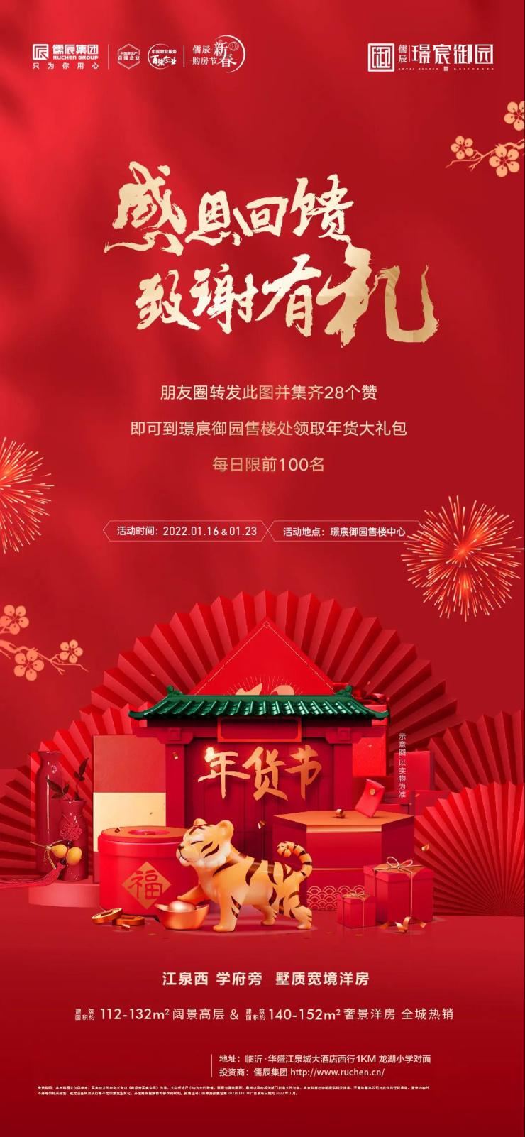 活动说明:璟宸御园、龙湖观澜府老业主,1.16日、1.23日周末,转发此条微信文章朋友圈集齐28赞,即可获得年货大礼包(每日限前100名)。团圆时刻,年味渐浓,年货大集不仅仅是一份新春之礼,更是一份暖心的生活关怀,快来儒辰·璟宸御园,把年味和精美年货一起打包,欢聚中国新年!