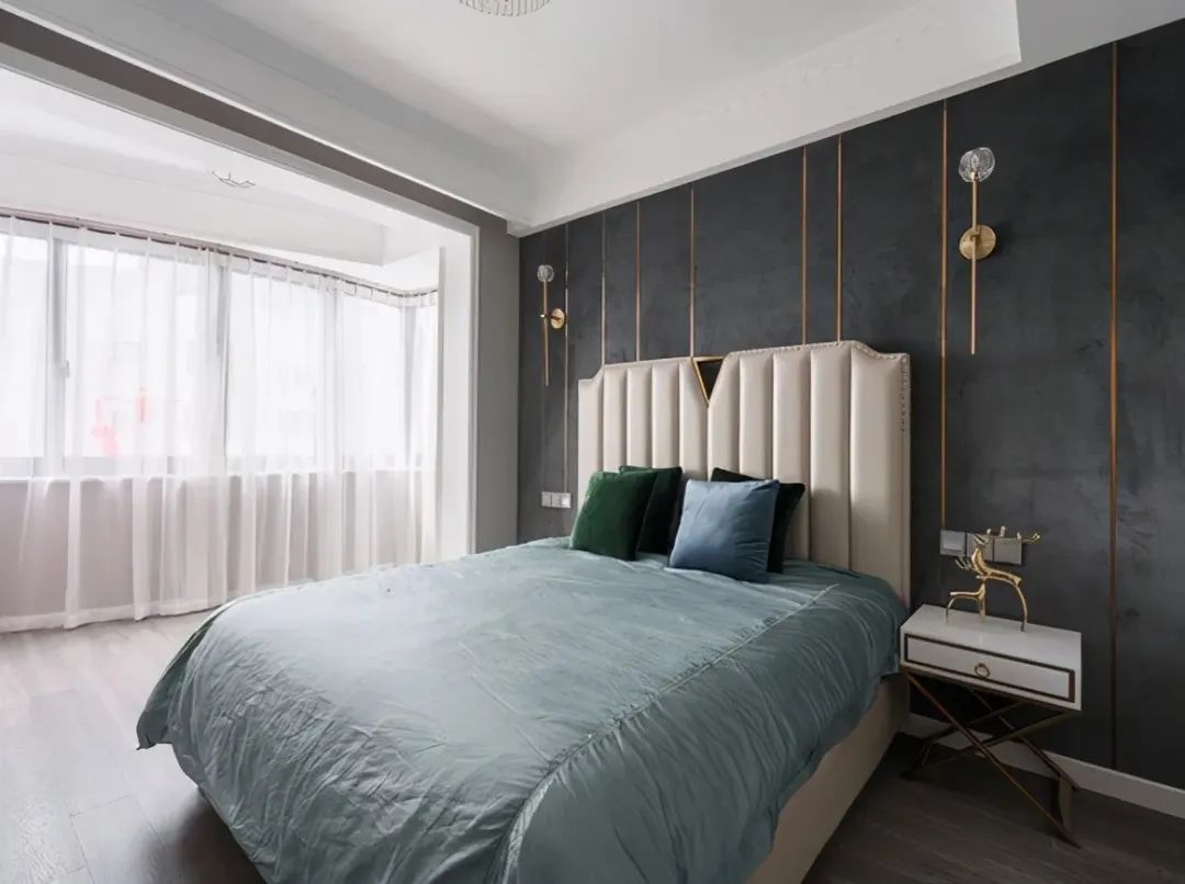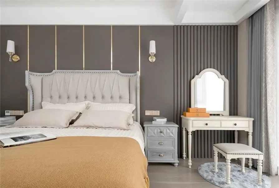 白色点缀高级灰的色调搭配,可以营造一种知性氛围,整个空间通透大气,淡化空间冷寂,柔和暖白中带着丝丝暖意,高端大气上档次。另外,还可以用护墙板、木饰面做装饰,给人更加柔和的视觉感受,添加卧室的时尚感。