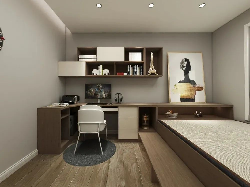除了睡眠,很多人还喜欢在卧室读书、工作、甚至是学习,所以可以采用卧室与书房的一体式设计,兼具休憩与阅读的双重功能。这种设计对于没有独立书房的户型也是十分的友好。