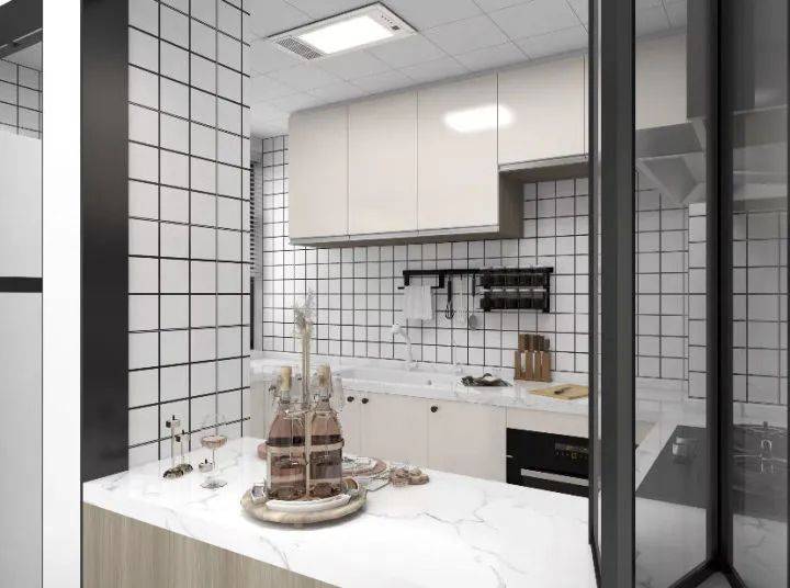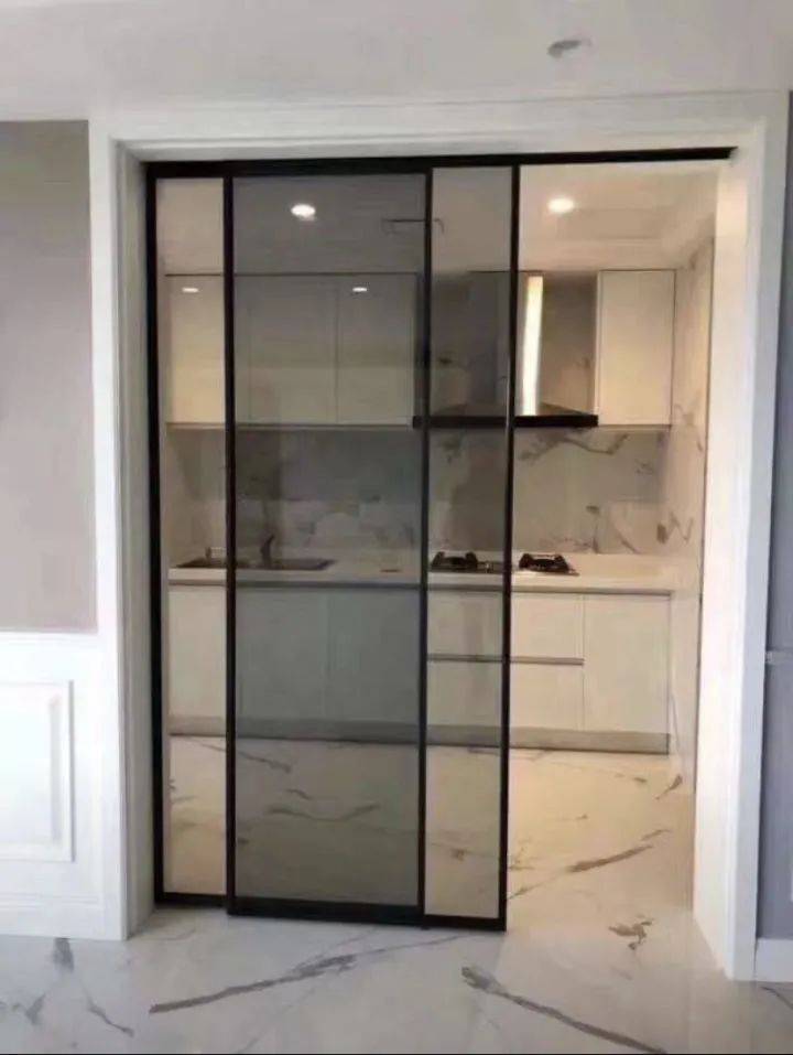 小厨房推荐用推拉门,节省空间,平开门要占用部分入口,可能会影响到橱柜门的开合。