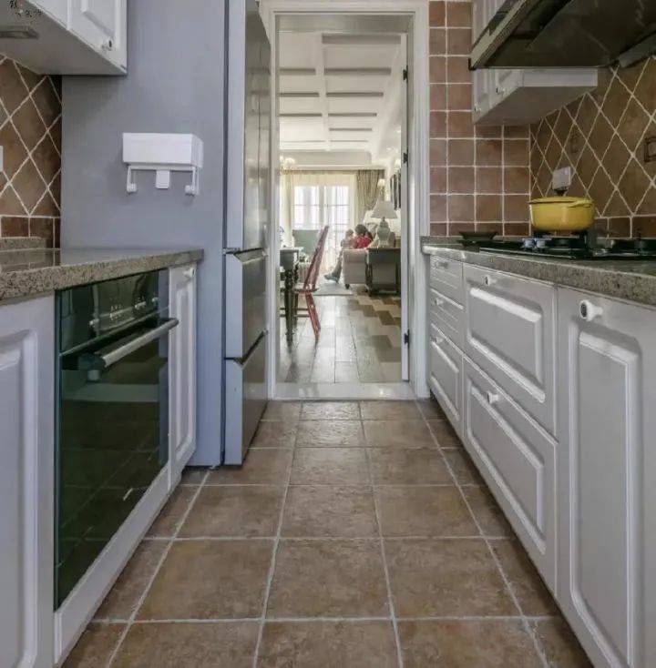 地砖都有防滑效果,铺在厨房也够用,与厨房外地面采用统一瓷砖,更能增强美感和空间延展的视觉效果。