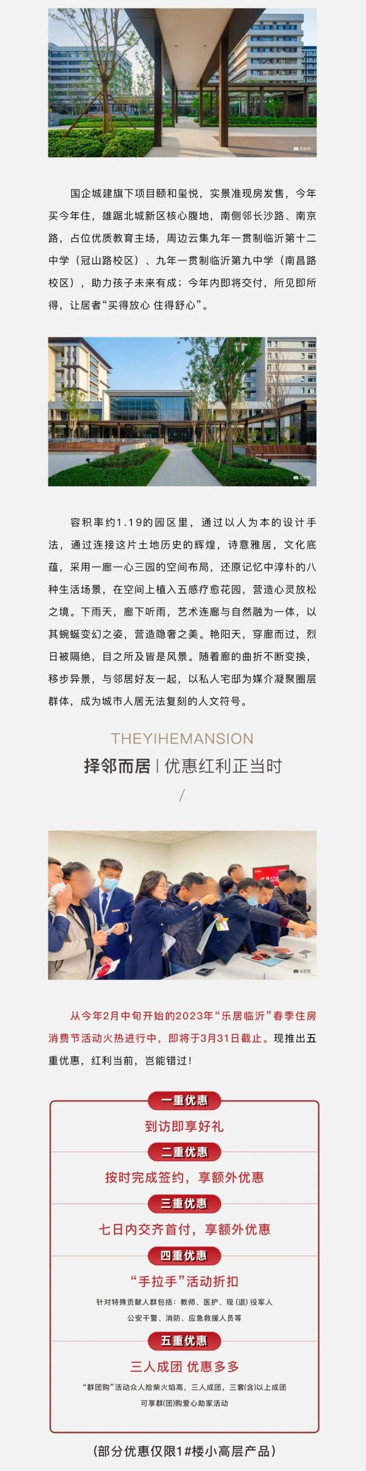 1.本资料中的图片、文字、数据仅供参考,不构成要约内容,最终结果均以政府批准的文件及买卖双方最终签订的商品房买卖合同为准。 2.本资料中对于项目周边环境、交通、教育及其他配套设施的介绍,旨在提供相关的信息,不意味着本公司对此作出的承诺。 3.本资料内容不排除因政府相关规划、规定及出卖人分期规划、未能控制等原因而发生变化。 本项目推广案名为: 颐和玺悦 ,政府备案名为: 临沂居家养老中心 , 本资料制作时间为2023年03月。