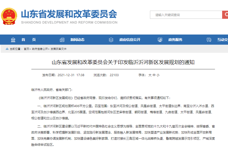 2022新年前一天,山东省发改委发布了《关于印发临沂沂河新区发展规划的通知》,落实了沂河新区这一省级重点发展区域的行政规划。此消息一出如平地惊雷,瞬间引爆临沂。