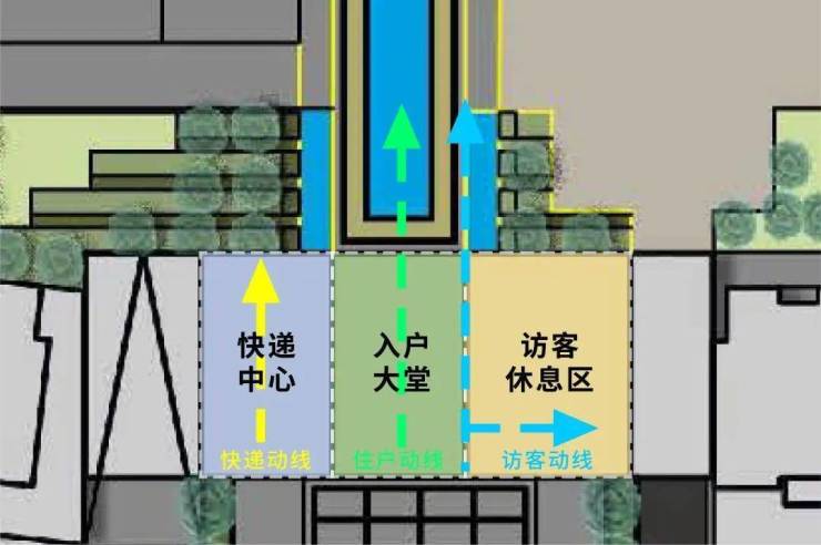 针对出入归家大堂的不同人群,海博龙樾府将归家动线细分为住户流线、访客流线、快递流线等,在主要节点进行 分流、灭菌 等设计,多流程动线设计使社区内每一条道路都各司其职,起到相互连通又有效区隔的作用。