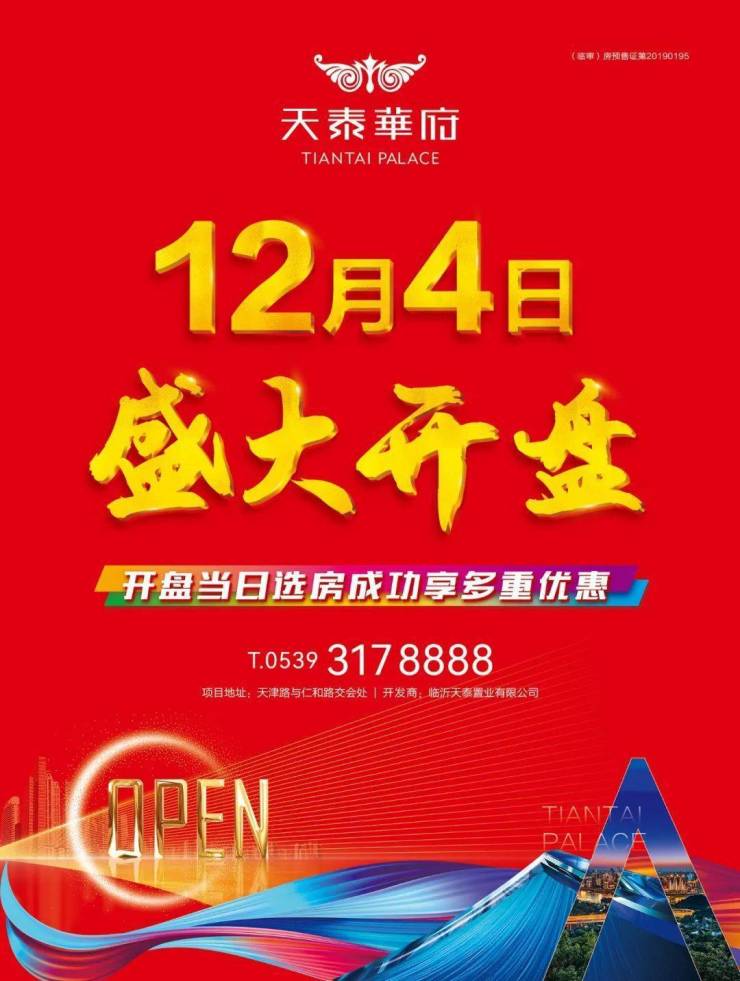临沂天泰置业有限公司由兴业集团、浩宇集团强强联合,深耕临沂近十载,打造了北城新区标杆楼盘—天泰华府南区项目。经过近十年的潜心雕琢,高端改善系住宅项目天泰华府北区12月4日盛大开盘,敬请期待。