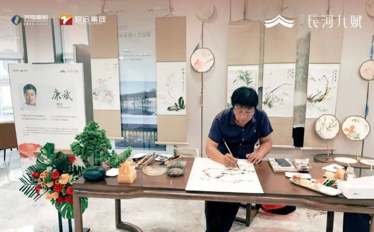 鉴盛世长河,品艺术东方。 知名画家康斌先生现场作画,墨香飘逸,画境再现中式山水意韵。这不仅是纯粹艺术的表达,也是东方文化绵延数千年的长河里,平面艺术的国画与东方建筑的共鸣。