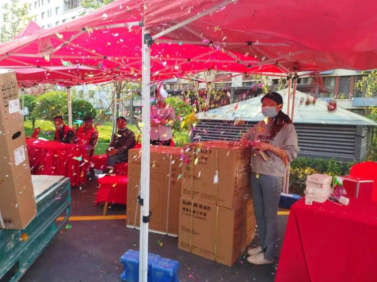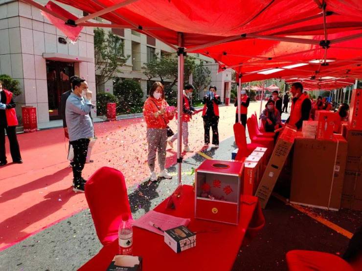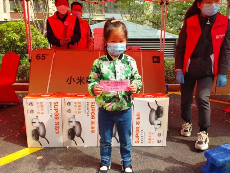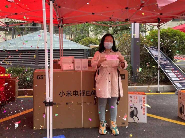 幸运抽大奖等着各位业主小米65寸智能电视、小米变频滚筒洗衣机、华为AI音响、华为Freelace无线耳机、苏泊尔锅三件套等礼品被接连抽出。