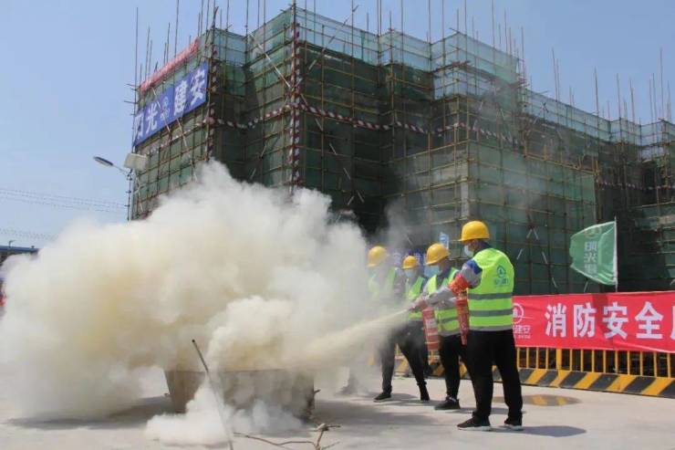 议程第三项为建筑工程防火应急演练,演练中包含正确使用灭火器扑灭火源,快速应急安全警戒及通讯保障等相关应急救援等内容,火情出现后,工作人员立即启动应急预案,果断处置,及时上报,并规范操作完成系列问题处置。