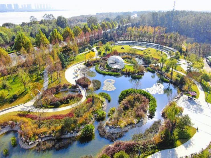 沿着公园蜿蜒的漫步道,行走在公园内湖畔,碧波映翠,水汽氤氲,荷叶相聚在湖中心,在阳光下更显青翠;"异形景观亭"位于湖中岛之上,婷婷袅娜,风姿翩然;湖畔周边灌木、乔木、花丛等参差排列,置身在此,美不胜收。