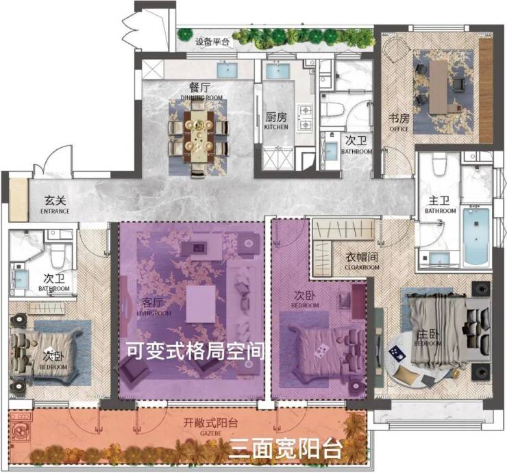 绿地·玺悦台建面约195㎡大平层,南向约10.7m、进深约1.8m的三面宽景观阳台,以风景融入生活;可变大宽厅,以尺度匹配胸怀,用窗外的旖旎风光,载起旷达的心境。