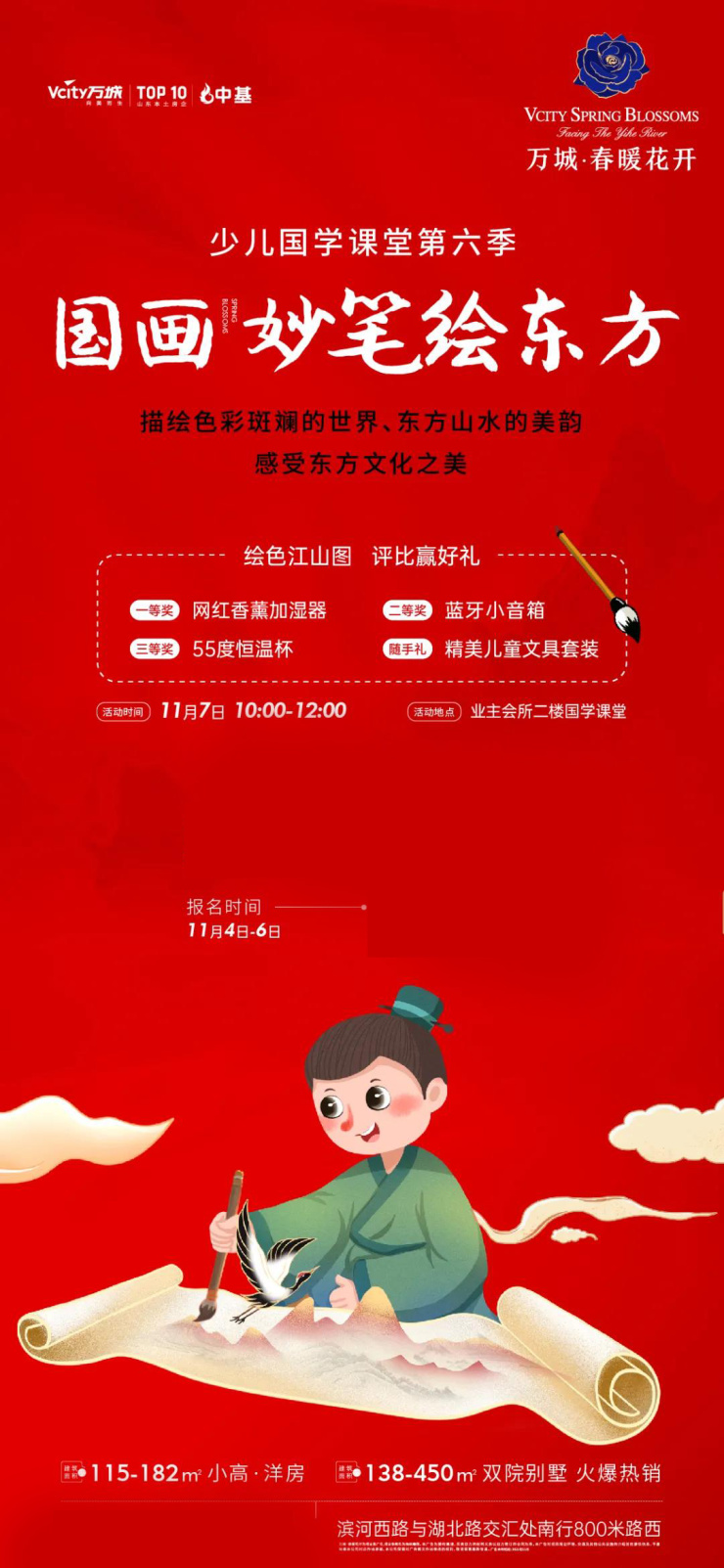 中华民族上下五千年历史,国粹文化也由此衍生,国画便是其中之一。摊开一张宣纸,挥毫泼墨之间;水墨丹青,绘编万载山河;青绿妙笔,谱尽千年人间。这不只是画里的艺术境界,也是鲜活有趣的孩童世界。这个周末(11月7日)少儿国学课堂第六课——妙笔绘东方即将开启。万城·春暖花开邀请小朋友们,一起复归古礼,传承中华文化之魂。