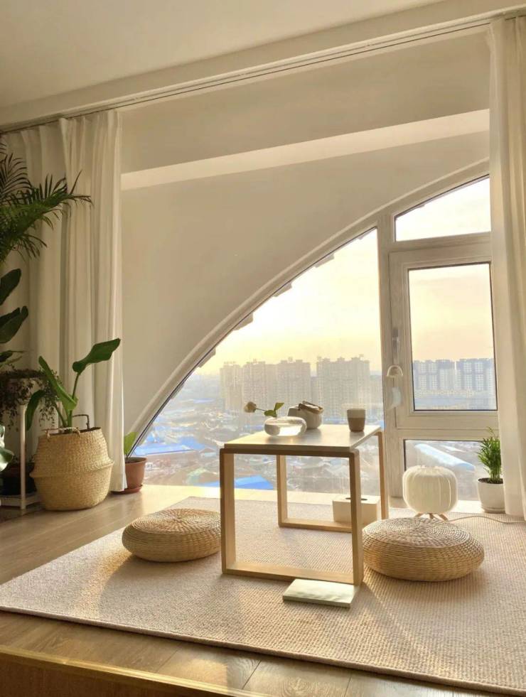 如果想要更大限度的进行利用,可以考虑在落地飘窗处定制一个地台,放一个榻桌、两个靠包,形成喝茶、下棋的娱乐空间。