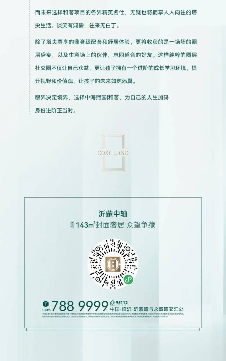 1. 本 项 目 推 广 名 为 “ 中 海 熙 园 ” , 备 案 名 为 “ 中 海 · 万 锦 熙 园 ” 。 开 发 公 司 为 : “ 临 沂 海 晟 地 产 有 限 公 司 ” 。 商 品 房 预 售 证 : “ ( 临 审 ) 房 预 售 证 第 2 0 2 2 0 0 7 0 号 ” 。 2 . 本 资 料 为 要 约 邀 请 , 不 作 为 要 约 或 承 诺 。 3 . 相 关 宣 传 内 容 不 排 除 因 政 府 相 关 规 划 、 规 定 及 出 卖 人 分 期 规 划 、 未 能 控 制 等 原 因 而 发 生 变 化 。 4 . 出 卖 人 可 能 会 不 定 期 对 宣 传 材 料 进 行 修 改 。 5 . 买 卖 双 方 的 权 利 义 务 以 双 方 签 订 的 《 商 品 房 买 卖 合 同 》 及 其 补 充 协 议 、 附 件 等 书 面 文 件 为 准 。 6 . 本 资 料 制 作 时 间 为 2 0 23 年3 月23 日 前 的 信 息 , 敬 请 留 意 最 新 资 料 。 中 海 服 务 监 督 热 线 : 9 5 1 1 2。