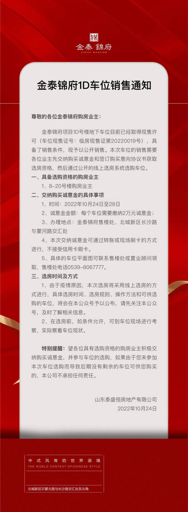 金泰锦府 | 车位销售通知