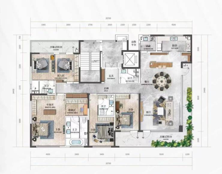 整体开间20.7米,进深14.4米,进深与面宽的黄金比例极值,既较大限度的展开了采光面,还兼顾了豪宅庭院深深的纵深感。