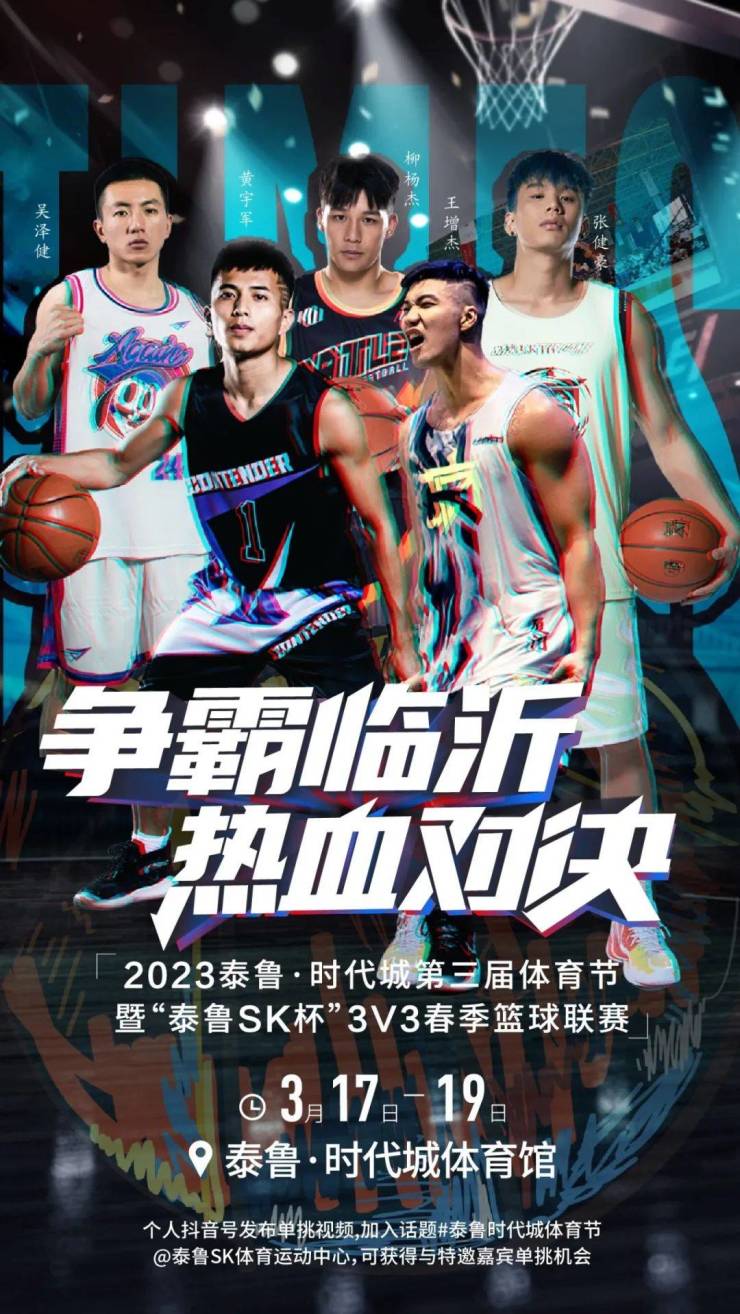 话题挑战:关注抖音:泰鲁·时代城、泰鲁SK体育运动中心,并在个人抖音平台发布明星挑战视频(视频拍摄规范参照抖音“泰鲁SK体育运动中心”账号示范视频【如背投、单挑、灌篮】),同时在发布时加入话题#泰鲁时代城体育节@泰鲁SK体育运动中心。将根据视频获赞量,选拔与网红篮球达人同台竞技机会。