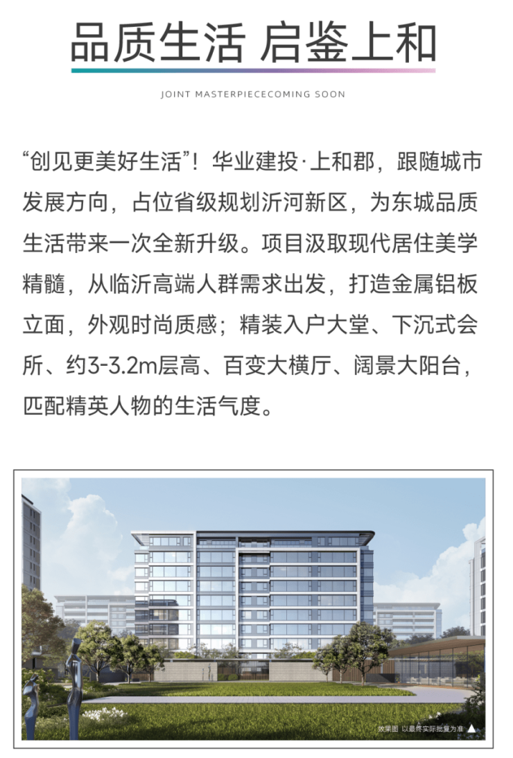 1.本资料内图片及文字仅供参考和一般信息使用,而并非提供全面信息或任何投资或其他专业意见,如因使用或进入本网站或任何链接网站,或依据本网站或任何链接网站的内容造成的任何误解,损失或损害,本公司概不承担任何责任。2.本资料所介绍的周边配套、政府规划、项目及产品信息旨在提供相关信息,不作为要约或承诺,内容可能因政府规划、规定及其它原因而发生变化。3.本资料宣传的项目图片为规划效果示意,与实景存在一定差异;所载户型系标准户型,与非标准层及特殊户型存在差异,相同户型单位因楼栋、楼层、单元等差别,局部结构、尺寸、面积等可能不同,所标尺寸面积仅供参考。户型图中的装修、家具、电器等设备物品仅为示意,不属于交付内容和交付标准。4.本资料为要约邀请,买卖双方的权利义务以双方签订的商品房买卖合同为准。5.本资料中部分图片及信息来自网络,如若侵犯媒体或个人的知识产权,请联系公众号后台,我方将予以删除。6.本公司保留对宣传资料进行修改的权利,如有更新,敬请留意较新资料。本广告发布时间:2022年5月。7.投资商:华业集团&东城建投 开发商:临沂华远城投置业有限公司 营销代理:星火燎原 整合推广:主动沟通 本宣传资料仅为要约邀请,所示图文、资料仅供参考,双方权利 和义务以商品房买卖合同和政府批文为准。相关内容如有变化,请留意较新资料。