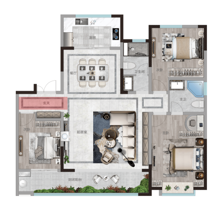 云栖玺悦一期纯洋房社区,全小区规划除两栋9+1层洋房,均为7+1层洋房,于一城之芯寸土寸金之地,打造一方低密纯洋房住区。下面我们就来介绍一下云栖玺悦的“入门级”户型A1云望,作为一个大三房户型,与其说是一处三居室的住房,其实更像是一次为“终极置业”而准备的住所。