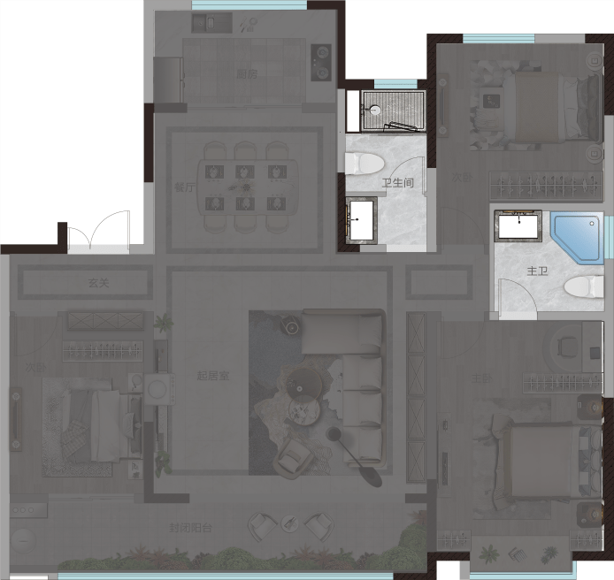 在家庭生活中,卫生间是一个很重要的、无法忽视的存在。三房中有些会是三代同堂居住,如果家里只有一个卫生间,就会出现排队上洗手间的情况。卫生间不够用,是很多家庭遇到的一个痛点,一个卫生间很难满足全家人的生活需要,而两卫就给足了生活尊重。卫生间作为使用频率较高的公区,很容易藏污纳垢。尤其有些房子卫生间是暗卫,接触不到阳光,加上干湿不分,室内潮湿,就很容易造成空气浑浊细菌滋生严重。所以对于对于现代家庭,卫生间设置明卫窗户和干湿分区势在必行。云栖玺悦双全明卫生间,共卫干湿分离,主卫方正明亮,让在不影响正常功能空间和舒适度的前提下,这样的设计不但有效解决早高峰卫生间使用紧张的问题,还解决了卫生问题。