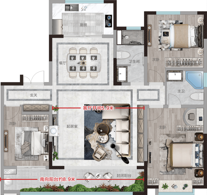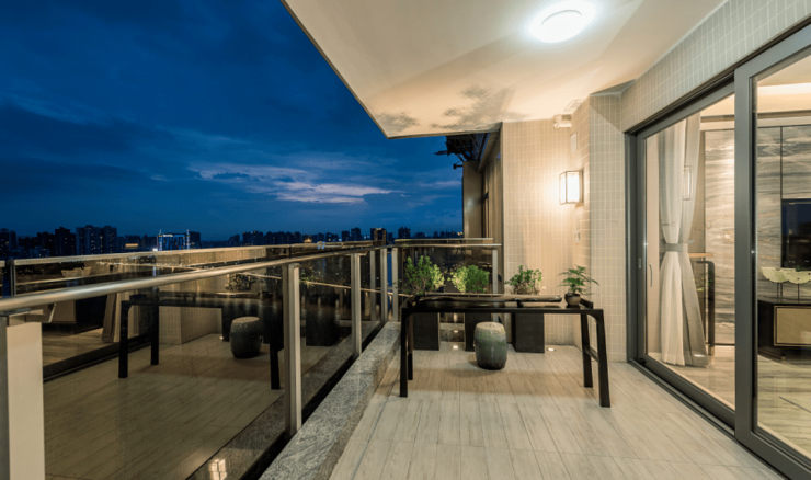 其中一间卧室和客厅共享南向大阳台,南向阳台约8.9米,“巨幕”式观景视野,保证空间的充沛采光,再加上错层处理的空中花园式的阳台,拥有双层挑高的向上空间延伸,不仅能够满足日常晾晒的基本需求,空闲时,在这里喝喝茶,赏赏花,也拥有无尽乐趣。