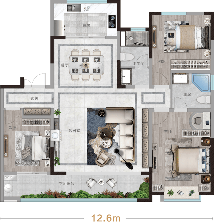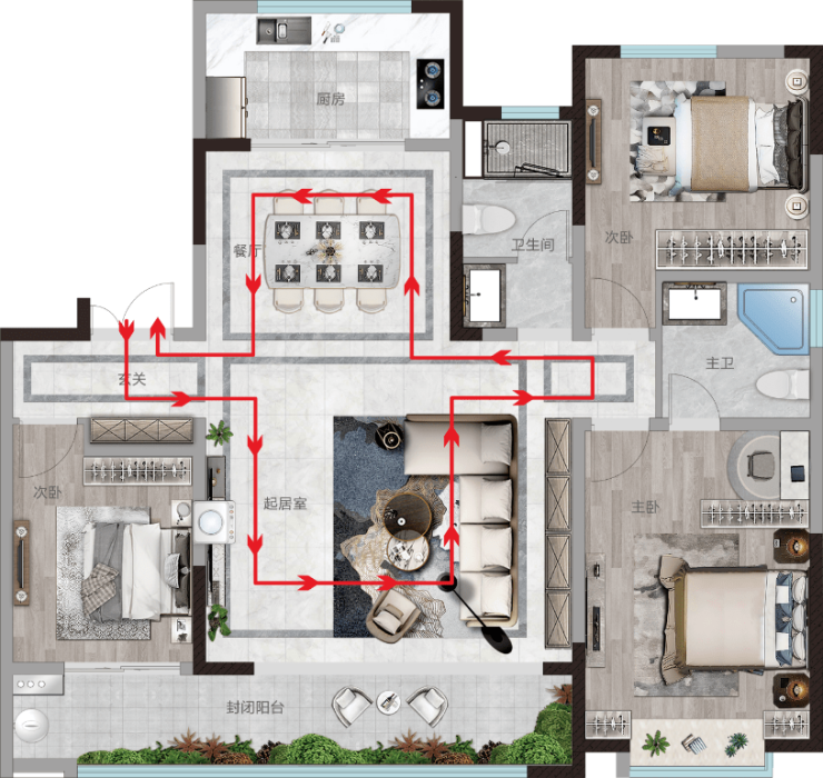 好的户型动线设计能大大提升空间的居住体验,通过合理的动线规划,能有效的减少或避免住户在空间内重复行走、劳动。动线的设计有两个核心:即“更短”和“更方便”。“动线更短”意味着能以更短的距离完成运动,“更方便”意味着能以更少的动作完成运动。比如A1云望这款户型,整体开间约4米,而且是客、餐、厨同宽。不仅视觉上更开敞方正,而且会围绕家具构成多条洄游动线,穿行更通畅。