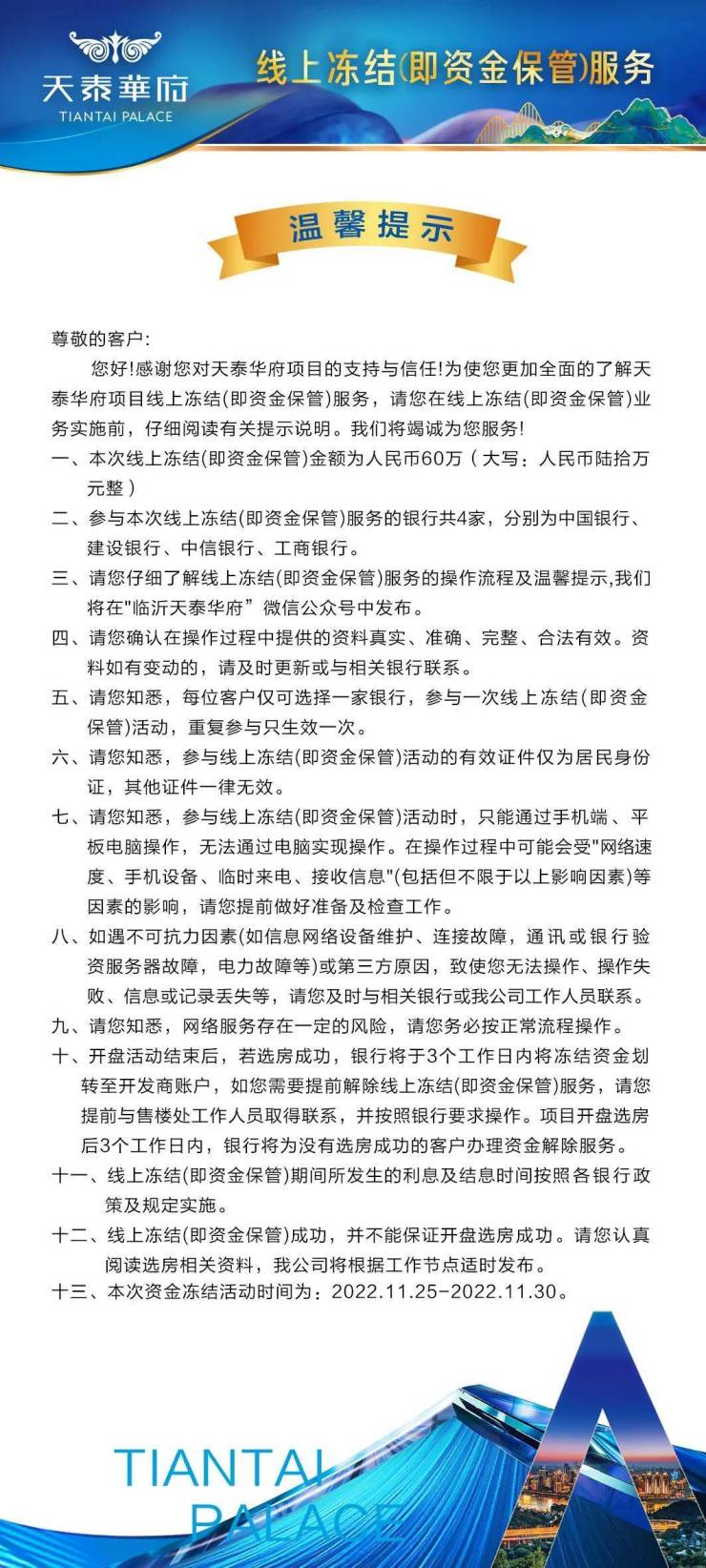 天泰华府购房资金临时冻结告知书