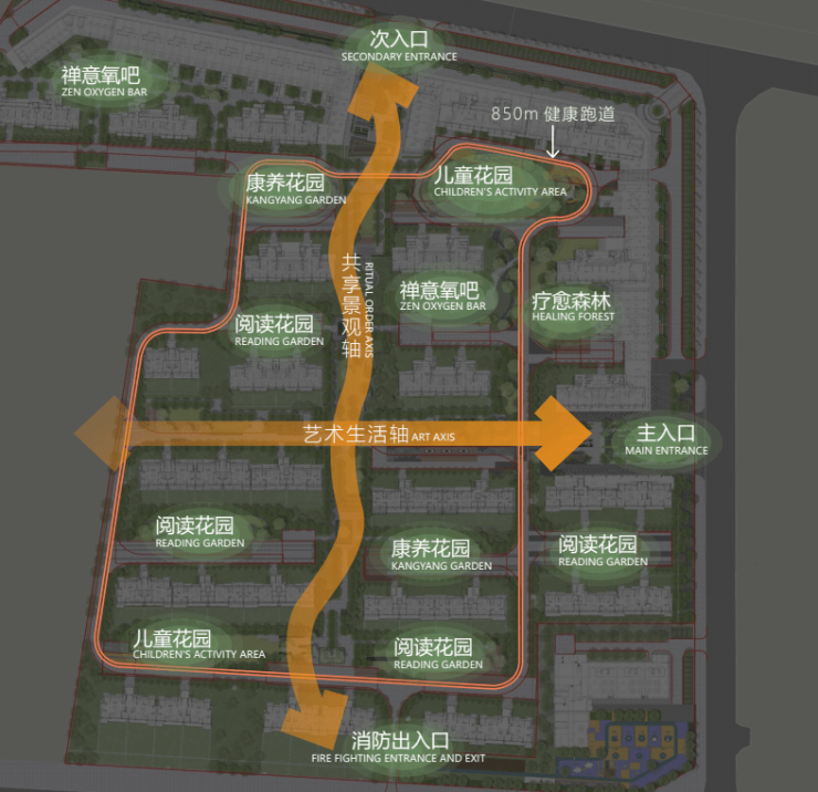 约 800m【聚能环式】专业健康跑道,串联社区入口、禅意氧吧、阅读花园、康养花园、儿童花园、疗愈森林的六大功能区,在活力和诗意间自由徜徉。