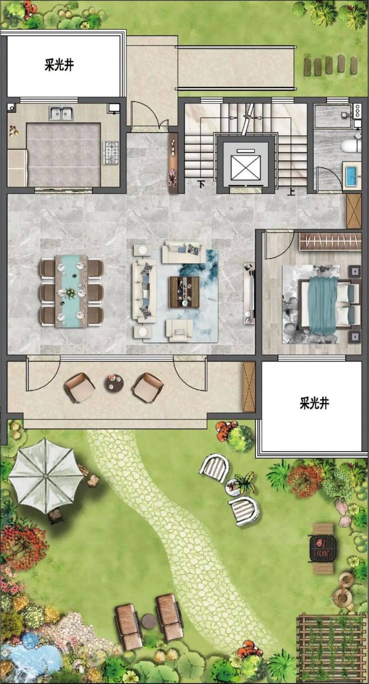 地下层挑高6米,搭配通透采光井,丰盛阳光直抵地下,可按主人想法自由分割改造,增加运动、休闲、会客、娱乐等功能,生活亦是多姿多彩。