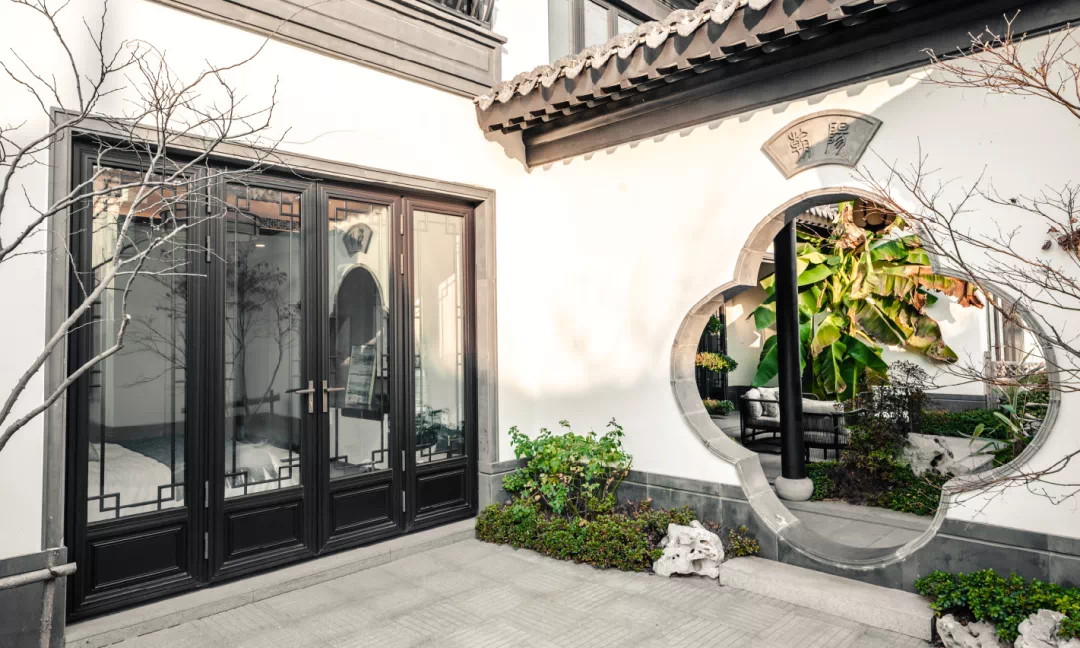 借鉴江南古典园林之造园技法,桃李春风巧妙的通过花窗、空窗、盲窗等技法,寓“通”于“隔”,以虚实相生、自然过渡。庭院之漏窗,虚实相映,化身四时烂漫的画框,不仅让白墙黛瓦更活泼,更形成一幅连绵的诗意画卷。