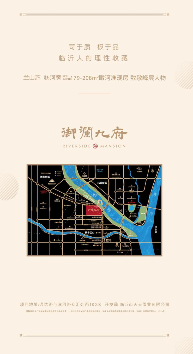 1、本项目开发商:临沂市天天置业有限公司;核准地名:御澜九府;2、本宣传资料为要约邀请,不作为要约或承诺;买卖双方的权利义务以双方签订的《商品房买卖合同》及其补充协议、附件等书面文件为准;3、本宣传资料内提到的商品房面积均为建筑面积,特别说明的除外;本宣传资料所涉及的户型仅供示意参考,所标尺寸面积、室内装修设计方案仅供参考,非实际交楼衡量之基准。相同户型因楼栋、单元或楼层不同,局部结构、面积、尺寸、管线布置等可能存在差异,具体以《商品房买卖合同》为准;4、交通配套信息、市政配套信息来源于官方网站数据,仅供参考。交通规划设置、市政配套设置不排除因政府规划、政策规定及出卖人未能控制的原因而发生变化,本资料旨在提供相关信息、不代表出卖人对此做出要约或承诺;5、部分素材来源于网络,其著作权归原作者所有;如果原作者表明其身份要求本公司停止使用该素材的,请及时与本司联系;6、相关宣传内容不排除因政府相关规划、规定及出卖人分期规划、未能控制的原因而发生变化;本公司保留对宣传资料修改的权利,敬请留意较新资料。