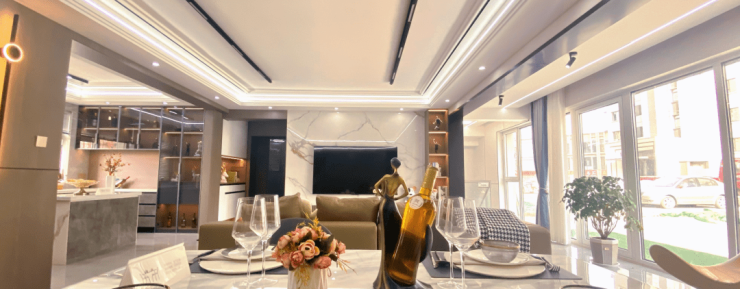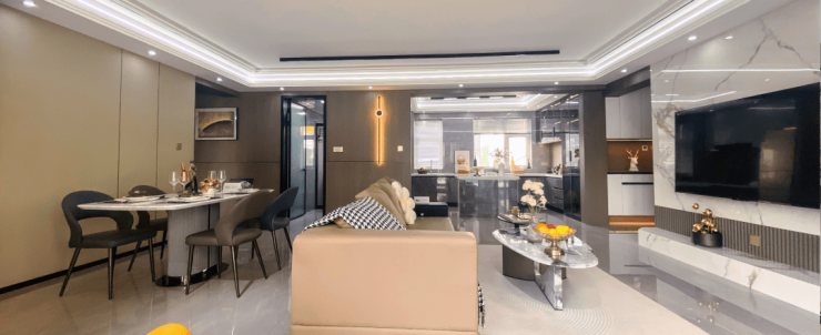 奢阔大客厅与餐厅、厨房相连相融,创新一体化空间格局,使得空间利用率更高,开敞又通透,一定程度上还能增加各个空间的沟通和互动。