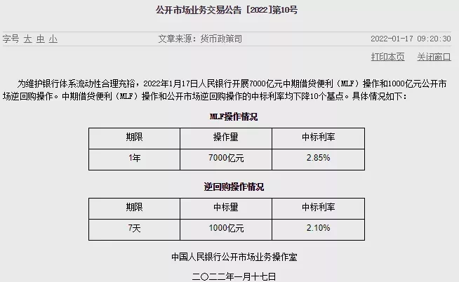 2021年1月17日,央行降息10基点,开展7000亿元1年期中期借贷便利MLF操作和1000亿元7天期公开市场逆回购操作,中标利率均下降10个基点。本次降息之后,1年期和5年期LPR都将同步下调,贷款利率(包括房贷利率)也将有所下降,强烈的信号指示意义可提振企业预期、稳定市场信心。