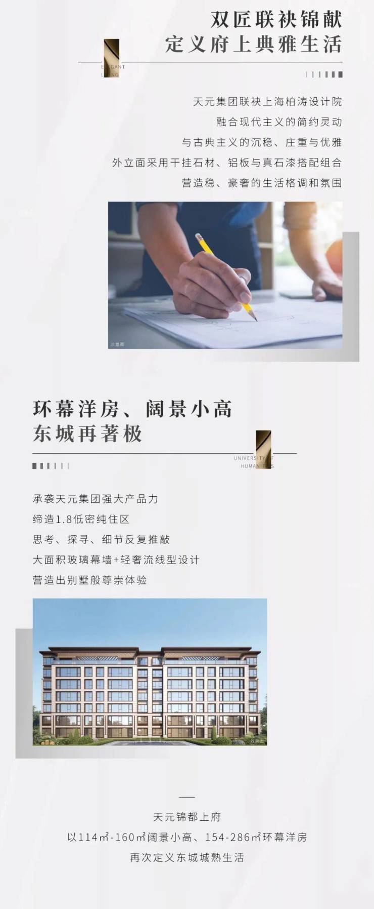 天元锦都上府以建面约114-160㎡阔境小高、建面约154-286㎡环幕洋房再次定义东城成熟生活。