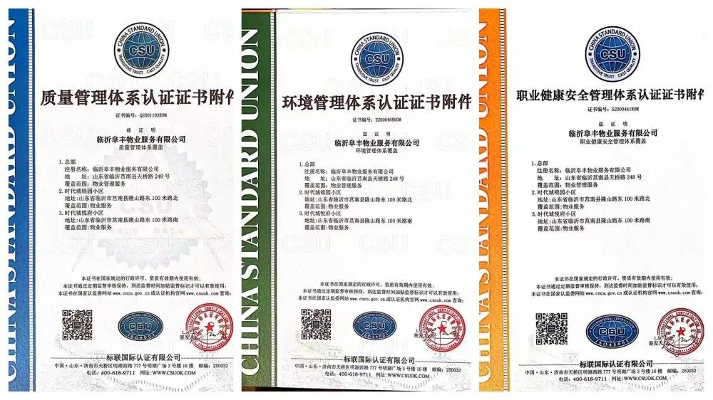 2020年7月,阜丰物业取得《AAA企业信用等级证书》,这标志着阜丰物业在规范运营、诚信经营上得到了认可。2020年10月,阜丰物业取得"三标一体"认证证书,这标志着物业服务水平迈上新台阶。